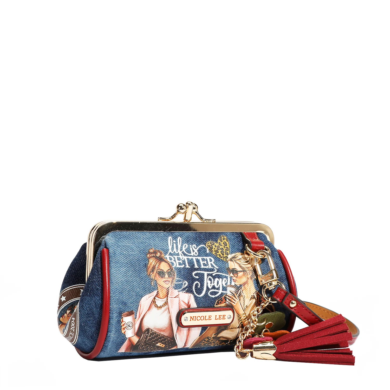 Κομψή από κάθε άποψη, η μίνι τσάντα μας με κλειδαριά kiss lock προσφέρει 2 θήκες και ένα λουράκι με φλερτ φούντα και λουλούδια.