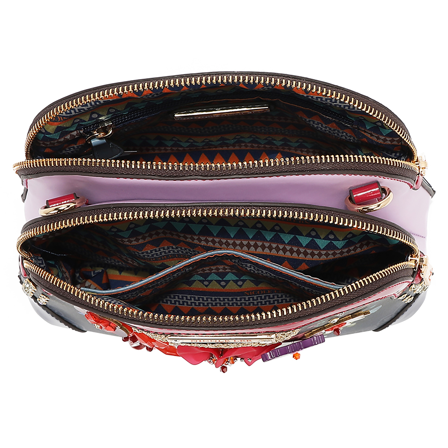 Μπροστινή πλευρά διακοσμημένη με λουλούδια από ρητίνη, παγιέτες, χάντρες και υφασμάτινες λεπτομέρειες (appliqués)