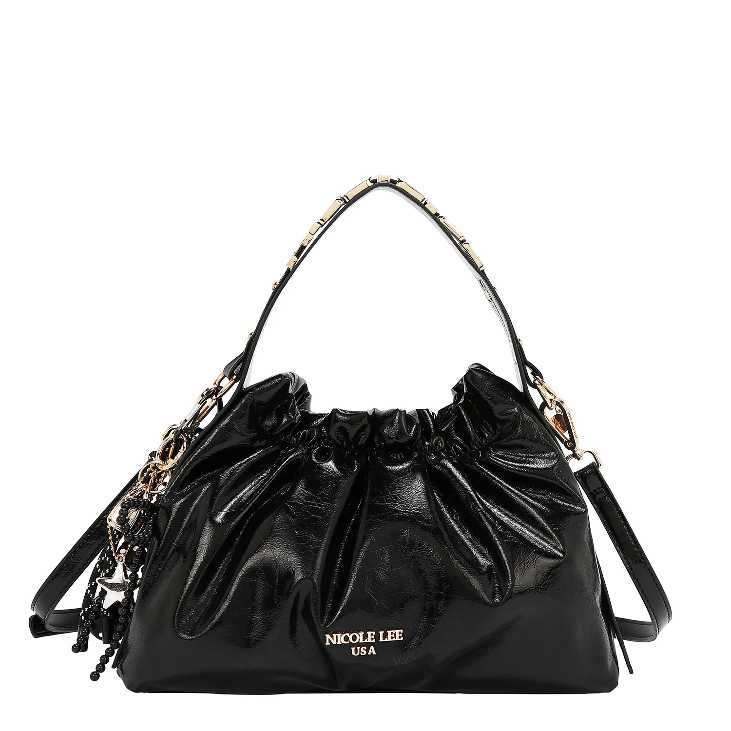 • Επίπεδη χειρολαβή με μεταλλικά γράμματα “Nicole Lee” σε χρυσό τόνο και αυθεντικό στρογγυλό γούρι Nicole Lee