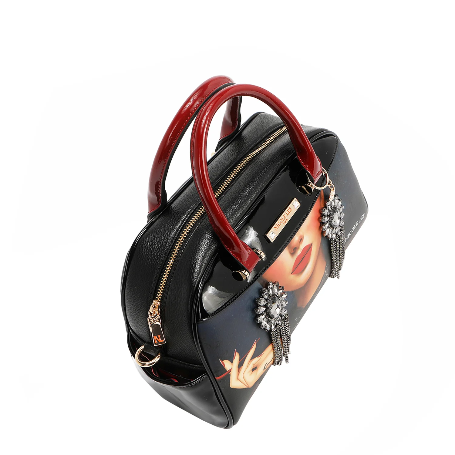 Εξωτερικό vegan δέρμα με γυαλιστερές λεπτομέρειες από λουστρίνι Διπλές λαβές στο πάνω μέρος με αυθεντικό κυκλικό charm της Nicole Lee Κύριο κλείσιμο με φερμουάρ διπλής κατεύθυνσης στο πάνω μέρος Το μπροστινό μέρος είναι διακοσμημένο με μεγάλα κρεμαστά σκουλαρίκια με στρας Πλαινοί δακτύλιοι D για προαιρετική σύνδεση λουριού χιαστί Πλαινές τσέπες Μεταλλικά πόδια στη βάση για πρόσθετη προστασία Πινακίδα με χαραγμένο λογότυπο και στρας με διαμάντια Φερμουάρ με χαραγμένο λογότυπο Χρυσαφί μεταλλικά στοιχεία Εσωτερική επένδυση από πολυεστέρα Εσωτερική τσέπη με φερμουάρ στο πίσω μέρος με λουράκι για κλειδί 2 εσωτερικές τσέπες Περιλαμβάνει ρυθμιζόμενο, αποσπώμενο λουράκι χιαστί Διαστάσεις: Μήκος31,25cm x Πλάτος11,25cm Ύψος18,75cm